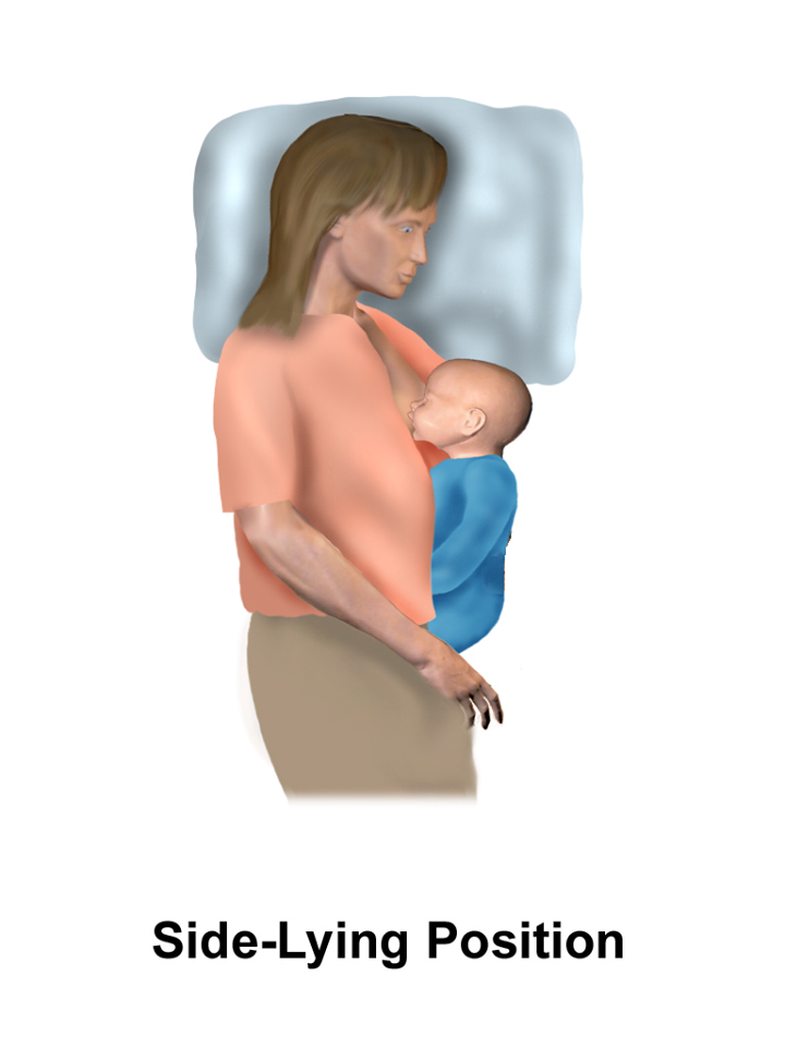 12) Horizontal (side-lying) breastfeeding position: The safest place for your baby to sleep is often on his/her own crib/bed. However, if you are able to sleep safely with your baby then when s/he wakes up at night try feeding her/him while laying down on your bed. This way you can go back to sleep and your baby will usually de-latch once s/he falls asleep. However, there are some risks to this as your baby may become used to sleeping on your bed and hence refuse his/her crib/bed. There is also a possibility of you or your spouse lying on your baby. Therefore, talk over this option with your pediatrician first before implementing it.